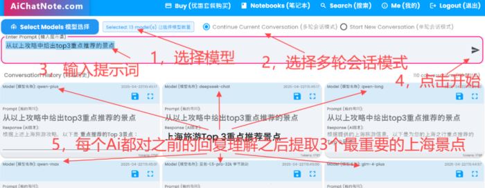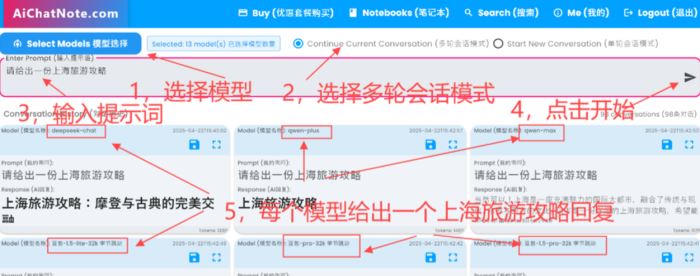 第一步,多轮对话模式下输入”请给出一份上海旅游攻略“,所有选定的模型并行计算,进行Ai回复,每个模型都给出自己的回复。