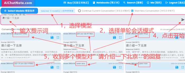 选择多个模型进行单轮会话,询问”请介绍一下北京“,所有模型并行计算,都会给出自己的回复。