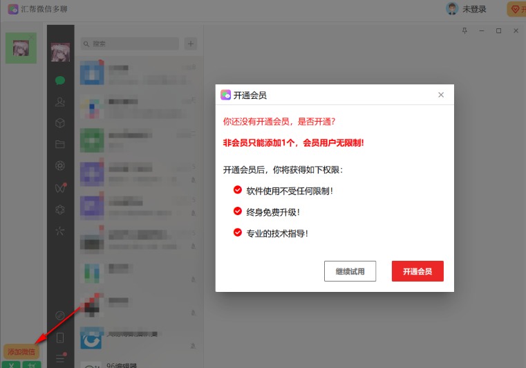 3、可以在左侧底部区域继续添加微信,如果你是会员就可以添加多个微信