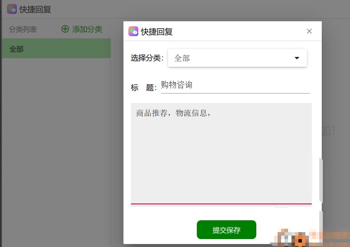 4、话术编辑功能,可以在软件增加新的分类,随后添加快捷回复内容