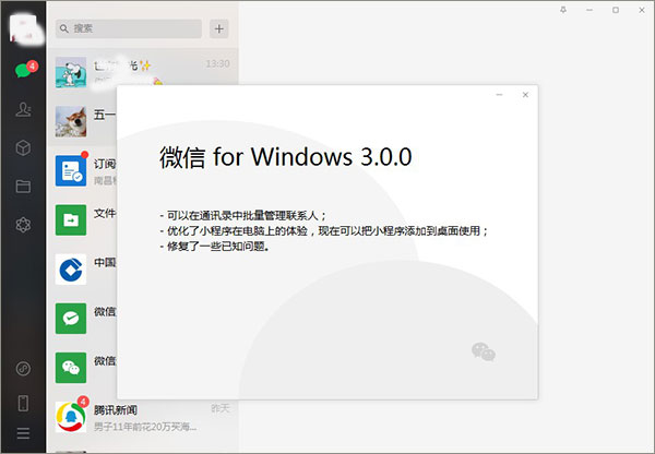 微信是非常火热的一款社交聊天工具,几乎就是人人必备,用户可以在电脑或手机上登录软件与好友聊天,让大家彼此拉近距离和及时沟通,也可以进行视频聊天和语音聊天等。不过近日,微信正式推出了微信3.0电脑版,该版本将解决微信多登录并且可以将小程序添加到桌面的功能,这可真的是多账号办公者的福音,并且在列表上方新增了一个通讯录管理功能,点击进入通讯录管理后,出现的是所有的好友呢称及其对应的备注、标签和权限,还能批量勾选好友进行批量的修改操作,就这功能相比原旧版本需要一个一个手动修改来说,批量操作可谓具有划时代的意义,这对于加好友比较多的的微信用户来说简直是福音。另外小编此次带来的不仅是微信3.0版本,还是绿色修改版,防撤回、支持多开、并去除了多余文件,感兴趣的用户快来下载尝试吧。