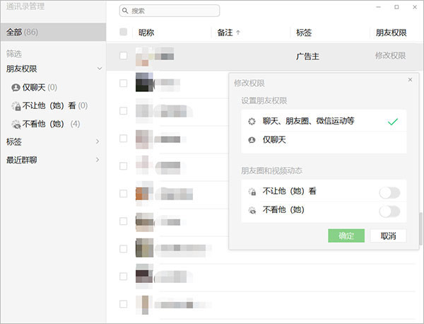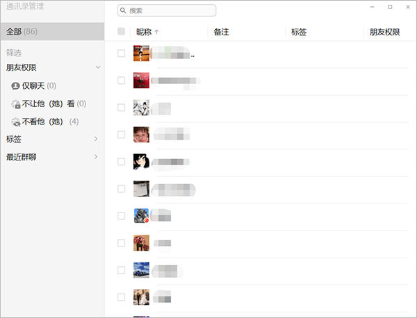 点击进入通讯录管理后,出现的是所有的好友呢称及其对应的备注、标签和权限。