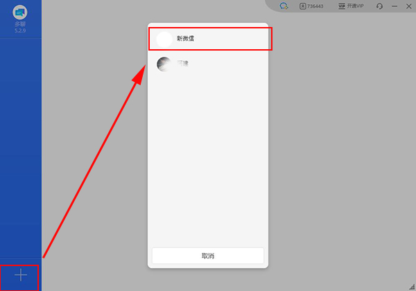 4、软件中可点击左下角加号,点击新微信可创建微信分身