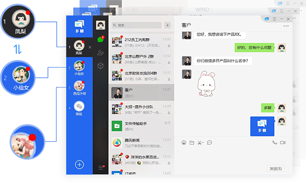 多聊是基于腾讯微信而开发的pc客户端,也可以称之为微信多开电脑版,非常适合手上有多个微信账号的朋友,用户可以在pc端通过它来同时登陆多个微信账号,非常方便,有了它之后就不需要几个微信号轮流登陆切换了,除了能够支持账号多开之外,还支持微信消息群发、好友排查、账号批量登录,快速加群加好友等功能。软件支持多个微信账号同时登录,轻松切换聊天窗口管理微信,告别杂乱桌面,提供消息提醒和话术管理,精确定位加上一键回复,提高沟通效率,话术导入和导出,通过共享同一套话术,提高沟通技巧,人人都是优秀者。该软件功能强大,界面友好,无需安装安卓模拟器,用户只需扫一扫即可登陆微信,用户初次进入软件即可免费获得十个微信分身的使用权限,再加上话术功能,可以帮助微信营销人员更好的推广产品,欢迎免费下载体验。