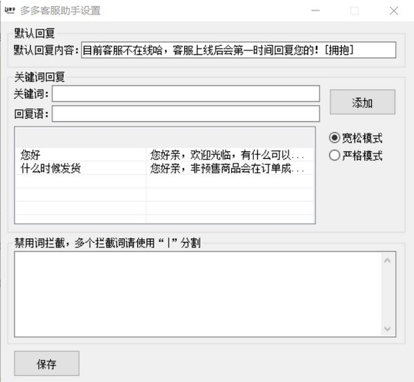 多多客服助手是一款拼多多客服自动回复软件,可以自动回复买家的消息,支持默认回复,关键词回复和禁用词拦截,有需要的可以试下,有啥BUG麻烦请留言反馈!