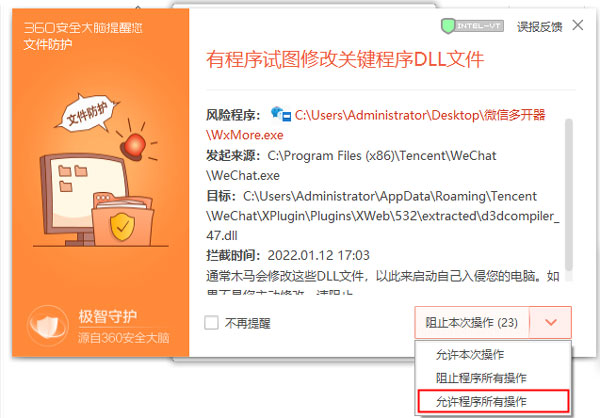 6、值得注意就是,安全软件会把这操作识别为异常行为,点击允许,添加至白名单即可。