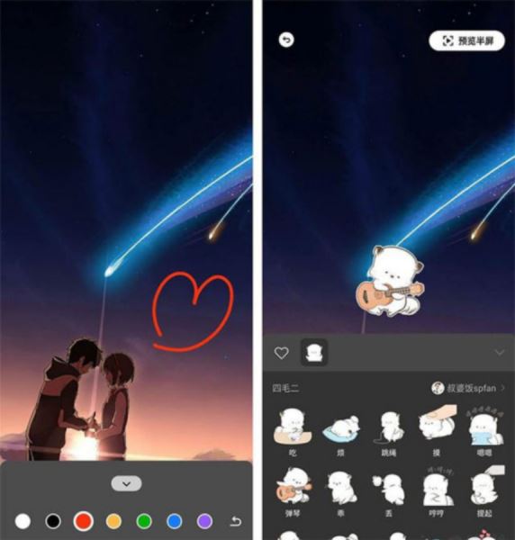 选好素材后点击下一步,在编辑页面中可以进行更为细致的私人定制。左下角的涂鸦工具可以画一些有意义图案;中间表情图标可以添加你收藏的表情包,表情是可以调整位置以及缩放的;
