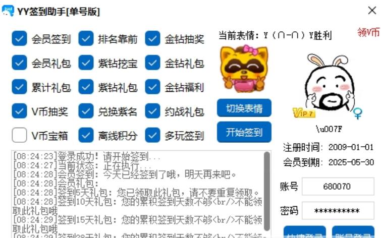 YY签到助手是多功能全自动签到工具,是具有多功能的会员签到助手,可实现全自动后台签到。YY会员用户们通过使用此软件可以实现一键签到。再也不用通过繁琐的逐个点击去签到啦,让你的签到方便快捷。本软件永久免费,无毒无控无后门!