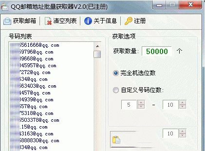详情介绍 QQ邮箱地址批量获取软件是一款很多人都想要的QQ邮箱地址获取工具,一键瞬间获取上万QQ号码邮箱地址,让邮件营销不在难,免除了其他采集软件设置的麻烦,是您网络营销的好帮手,感兴趣的朋友千万不要错过了。 【基本介绍】 功能特色: 1、支持自已来定义获取数量, 一键瞬间获取上万QQ号码邮箱地址。 2、支持完全机选位数和自定义号码位数。 3、支持获取的QQ邮箱地址复制到剪贴板。 免除了其他采集软件布置设置。 4、支持导出QQ邮箱到文件程序。 5、支持导出QQ号码到文件。 QQ邮箱地址 批量获取