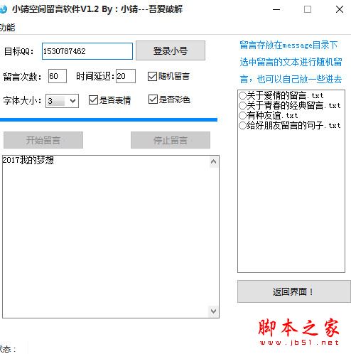 详情介绍 小靖空间留言软件是一款QQ空间随机留言软件,它可以支持在空间里随机的留言发文字,帮助你快速提升人气,需要的朋友快来下载使用吧。 小靖空间留言软件使用说明 保存作者的设置可以保证稳定留言 如果有需要留言的大批量留言可添加到message文件保存为TXT文本格式每行一个,不可保存其他可是否则会报错下面 小靖 空间留言 留言软件