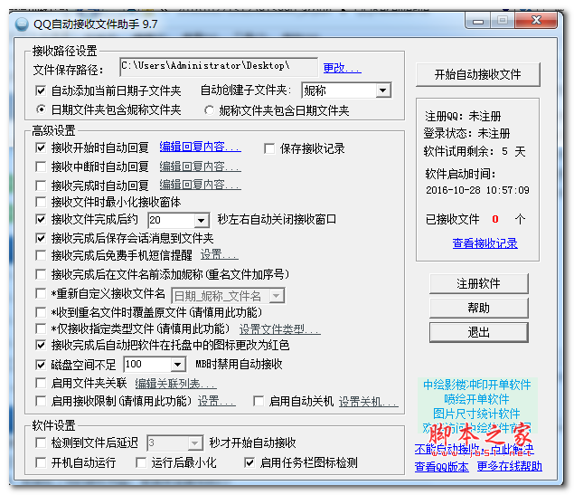 QQ自动接收文件助手实现全自动无人值守接收QQ文件,弥补QQ不能自动接收文件的遗憾,是您日常工作接收文件的好助手!软件能同时接收来自不同好友发来的文件,能运行于win xp/2003/vista/win7等环境下。