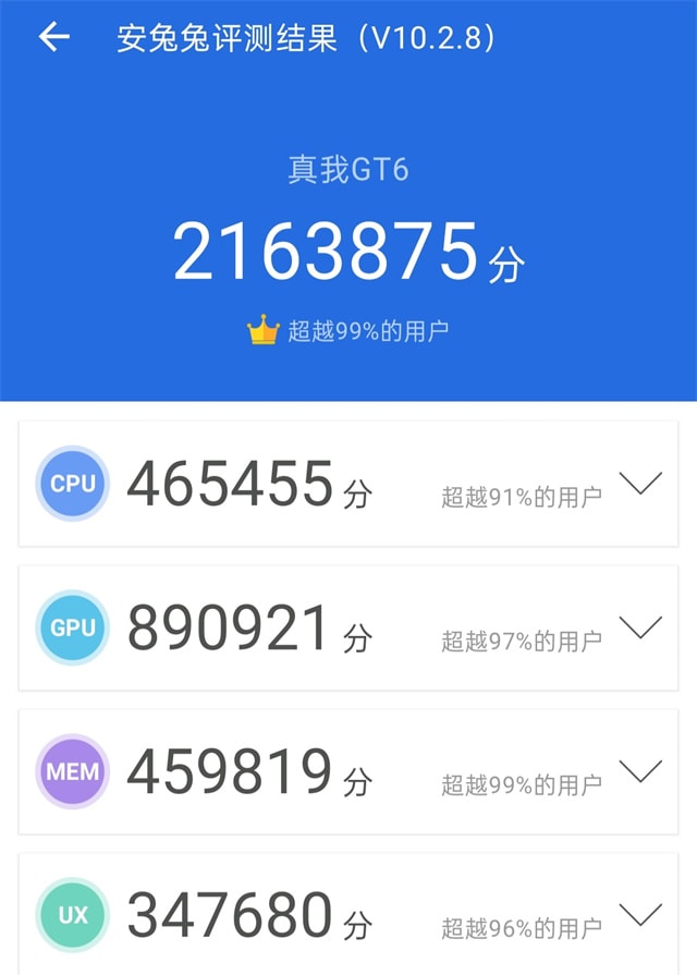 从安兔兔V10的跑分成绩来看,真我GT6在常温下跑分可以轻松获得216万以上的好成绩,对于高通第三代骁龙8移动平台来说,这个成绩也是比较高的了,看来这段时间的调校也让这颗芯的性能发挥更极致了。