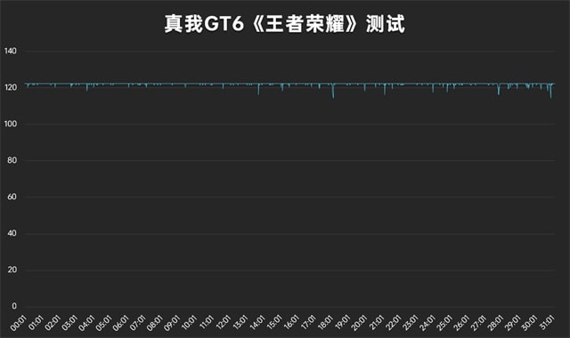 那么接下来就要看看实际的游戏体验了,《王者荣耀》最高画质120fps的情况下,可以看到游戏帧率是十分稳定的,无论是对线还是打团,帧率都表现的十分稳定,平均帧率120fps妥妥的,对于真我GT6这种级别的直屏游戏手机,《王者荣耀》实在是不成什么问题了。