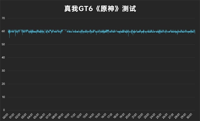 那就选择老生常谈的《原神》吧,可以看到,在最高画质并且开启60fps模式下的《原神》中,我们还是室温条件下,在须弥不断移动。可以看到真我GT6平均帧率59.95,流畅度也来到了99.24,抖动率仅为0.86,可以说游戏的体验已经非常Nice了,平均功耗也仅为4.9W左右,小小《原神》,轻松拿下。