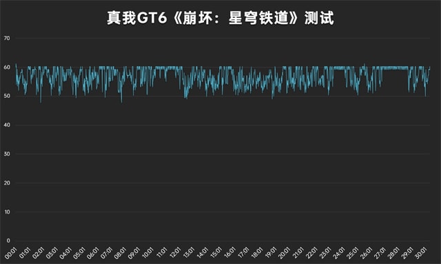 那必须给真我GT6上点强度了,直接打开“众生平等”的《崩坏:星穹铁道》最高画质下开启60fps,在雅利洛6不断进行移动,以模拟大场景下的性能表现,真我GT6在这个场景下表现的也非常稳定,平均帧57.08,流畅度92.57,抖动率仅为1.58。“众生平等”的《崩坏:星穹铁道》除了在带主动散热的游戏手机上以外,能够稳定30分钟而不限制频率的手机并不多见,真我GT6算是一个。
