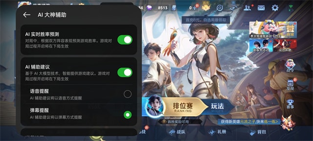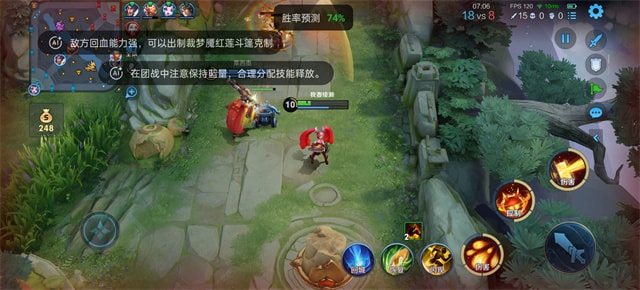 除了性能足够强以外,真我GT6还在游戏方面进行了许多优化,首先就是将AI加入到游戏过程中来,让游戏体验更有趣了,比如AI的胜率预测,可以根据游戏过程中双方的情况预测胜率,当然胜率仅供参考,不过AI大神辅助这里面有个事件提醒,还是非常好用的,比如上路、中路的敌方消失以后,就会给出提醒,让玩家注意敌方动向,还有BUFF、龙坑的刷新提醒,都十分的方便。