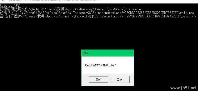 1、软件下载解压完成后,点击win10修改QQ透明背景.exe打开软件,软件会检测背景文件夹位置,自动显示图片确认是否正确,如果图片没有问题的话,就可以直接点击是。