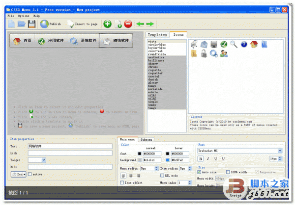 详情介绍 CSS3Menu一款网页导航菜单制作工具,并且能导出标准的 html + css 文件。CSS3Menu 能帮助你十分简单并且省事的创建一个导航栏菜单,你只需点几下鼠标,选几种颜色,就这么简单。 【3.5更新说明】 +菜单前面可自由添加ICO图标。 +自定义导航背景。 【相关下载】 CSS3Menu for Mac版本下载 另有:CSS3Menu for Mac 版https://www.jb51.net/softs/56832.html CSS3Menu 网页导航菜单制作