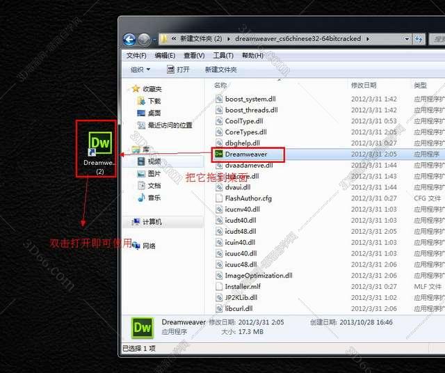 由于我们安装的Adobe DreamWeaver cs6【DW cs6】是绿色版。所以需要我们把“DreamWeaver”图标拖到桌面或者创建快捷方式拖到桌面上