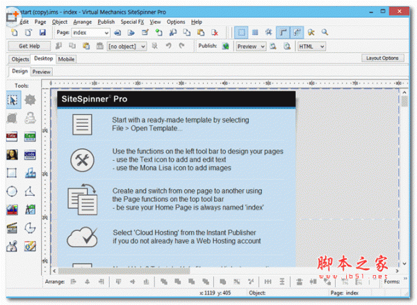 软件介绍你不需要懂得任何的网页编程知识,因为Virtual Mechanics SiteSpinner是一款100%真正的所见即所得的网页编辑工具,你可以用鼠标移动任何东西到任意位置,你不需要使用任何图片编辑器,只需要点击右键菜单就可以轻松改变任何图片的体积或者属性,并可以创建图形、背景、增加阴影或者透明度等操作,不需要任何FTP工具就可以轻松的上传你的网页到互联网上面!再加上完善的帮助系统,实在是你制作网页的好帮手!