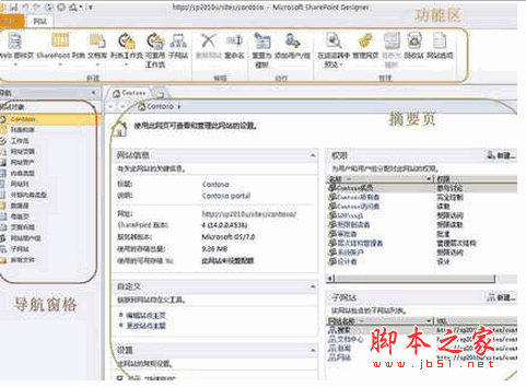 和其他Office组件一样, SPD现在也采用了Ribbon界面。SPD中的Ribbon会根据我们当前焦点对象(站点,列表,工作流等)的不同而变化。当然,需要一段时间来适应, 但是当你适应后,它将大大提高工作效率。摘要页可以显示出当前查看对象的常用设置和摘要。比如,当我们点击一个列表时,摘要页会显示列表的标题,描述,所 有的视图,窗体等等信息。导航窗口可以方便的使我们在站点内选择各种类型的对象(列表,工作流,网站页面等)。总之,新的界面使我们对 SharePoint站点内容的操作变得非常方便。