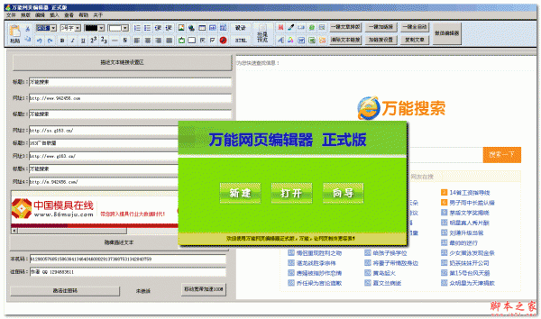 详情介绍 万能网页编辑器一款免费的绿色版轻巧实用的可视化网页编辑器,所见即所得,即使您不懂网页标记语言,照样可以轻松制作出自己的网页。 它可以用来设计简单网页 万能网页编辑器使用易语言编写完成,绿色安全。 更新功能 增加自定义设置批量文本链接。SEO文章专用 一键清除文章链接。 一键批量添加描文本链接,合适经常处理文章网编朋友。 根据用户需求配置微信编辑器 微信编辑器为在线版 正式版 网页编辑器 万能
