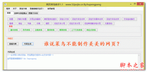 详情介绍 网页菜鸟助手是一款适用于菜鸟的制作网页工具。如果你是新手,那么这款软件就非常适合你,它是一个易于操作的网页制作软件,可以让你几分钟即可创建自己制作的网页,而且美观好看,无需懂任何HTML知识和安装dreamweaver。 你只需要拖曳对象到页面中并随意的调整它们的位置即可!欢迎下载使用! 更新内容 1.图片的元素以及美化 2.网页文本美化 3.背景色美化 4.其他元素的使用美化 5.优化了软件更新机制 网页 菜鸟