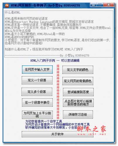 详情介绍 HTML网页制作是为初学者提供的一个网页制作自学工具。为网页设计者提供一个网络编程的中文参考工具,对于每个希望制作网页的初学者朋友,是非常实用的一款工具。 HTML网页制作软件功能1.可定义多个段落(可在程序内直接编辑代码) 2.自定义字体、颜色(可在程序内直接编辑代码) 3.可定义网页背景颜色(可在程序内直接编辑代码) 4.图片超链接(可在程序内直接编辑代码) 5.可制作水平分割线(可在程序内直接编辑代码) 6.可制作超链接(可在程序内直接编辑代码) 7.有学习总结。 HTML 网页 制作