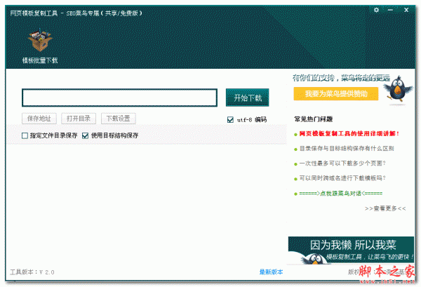 菜鸟网页模板复制工具,是一款复制网站模板的工具。菜鸟网页模板复制可以复制目前众多网站的模板,根据自定义的路径进行复制,可将JS脚本、图片、样式等内容完整的复制下来。当前工具模板为V2.0,后期将继续完善与修改工具的功能!