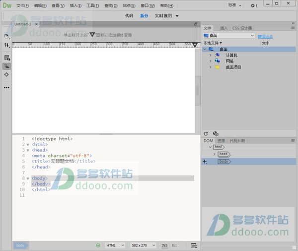 此工作区包括您处理代码和设计时所需的所有内容,例如“文件”、“CC 库”,“CSS Designer”、“插入”、“DOM”、“资源”和“代码片段”面板。