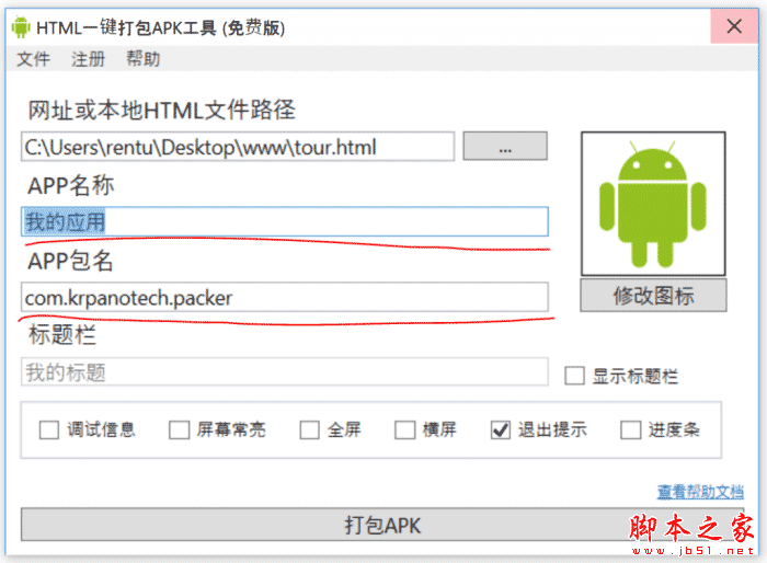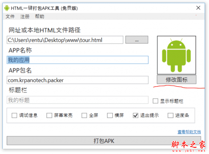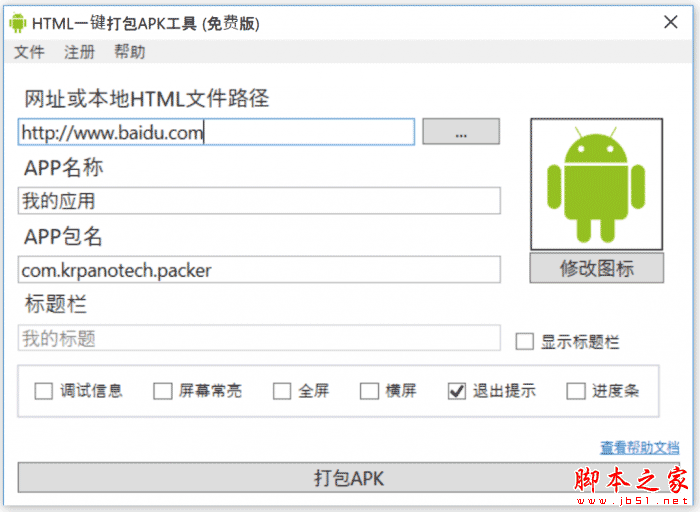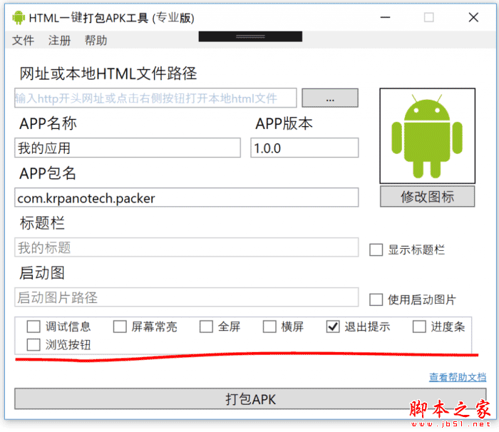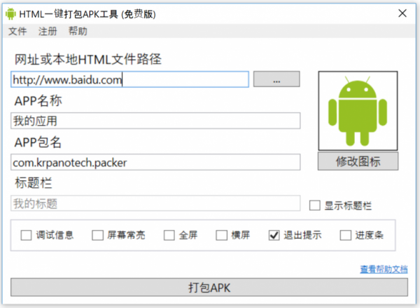 3.支持自定义图标,自定义APP名称,自定义包名,全屏,横屏,退出提示,保持常亮等选项