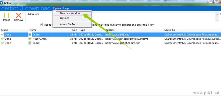 2、要到这里,请单击任何GetBot窗口中的打开链接,然后选择新建站点窗口
