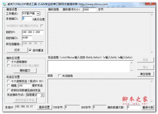 详情介绍 卓岚TCP/UDP调试工具是一款Socket测试TCP、UDP测试的小工具SocketTest,可设置本地工作模式与本地端口,目的IP及目的端口,设置接收区与发送区参数。发送数据时可增加奇偶校验。 测试械:UDP组播/TCP客户端/UDP 功能介绍 可设置本地工作模式与本地端口,目的IP及目的端口,设置接收区与发送区参数。发送数据时可增加奇偶校验。 TCP/UDP 调试工具
