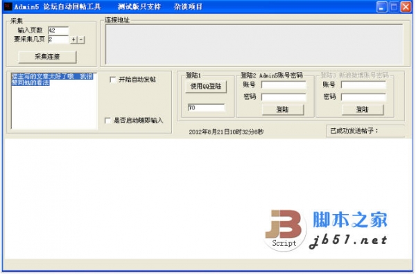 Admin5论坛挂机跟帖器:此版本仅支持杂谈类目,每发一个帖子 会有一个 A5币哦。 也是赚A5币的好方法 一小时 60个 一天就七百多个,辅助请不要输入页数过多。因为1页=50个帖子!