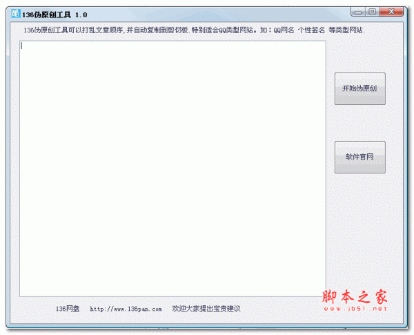 详情介绍 136伪原创工具是一款绿色免费的由136网盘官方开发的的专业伪原创工具。软件功能强大,该工具仅适用各类QQ类型网站.如QQ网名 QQ签名. 游戏名字,QQ分组 等网站.专门针对百度、搜狗、360等大型搜索引擎收录设计。通过伪原创工具生成的文章,会更好的被搜索引擎收录和索引到。 【136伪原创工具功能特点】 打乱文章排序,并自动复制在剪切板.效果特别好.欢迎提出您的宝贵建议. 【136伪原创工具使用方法】 1.输入内容 2.点击“开始伪原创” 136 伪原创工具