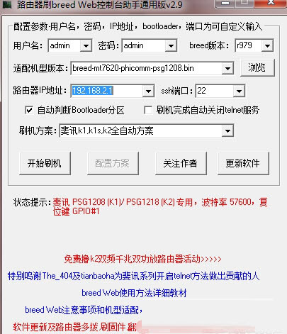 真正的斐讯K2路由器刷不死固件+多拨网速叠加翻倍教程是一款路由器刷breed Web控制台助手+教程,首先硬件肯定是某东免费撸的k2 路由器了10月份的时候搞了一台,一开始只是刷个华硕的固件,觉得穿墙信号不错当普通的路由器用用。后来没事的时候在别的论坛碰巧看到在讨论多拨,可以网速叠加翻倍,,瞬间就来了兴趣,于是各种刷机调试,,,,后来肯定是成功了。