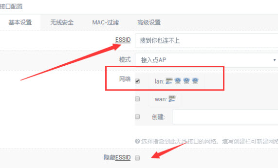 网络那里要勾选lan,隐藏ESSID就是不想让别人搜到你的wifi