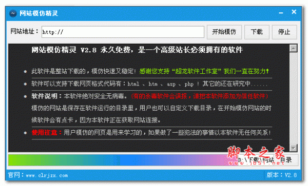 1.本软件绝对安全无病毒。(有的杀毒软件会误报,请把本软件添加为信任软件) 模仿的网站是保存在软件运行的目录里,用户也可以自定义下载目录,在开始模仿网站的时候软件会有点卡,因为本软件正在获取网站连接。