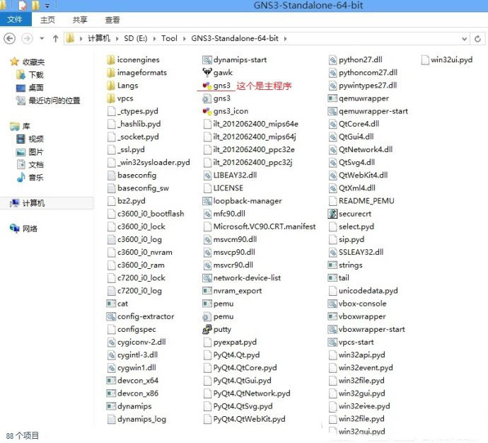 解压出来的文件如图。共88个文件。其中gns3为主程序。