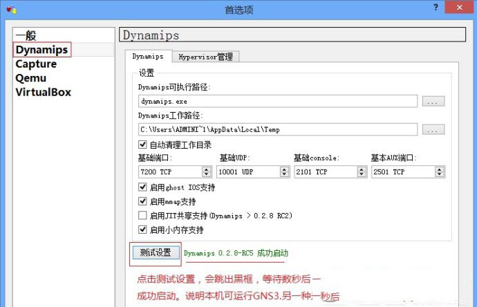 点击编辑-首选项-Dynamips-测试设置,进行Dy环境测试。正常通过的结果如图所示。这步非常关键。决定了我们的电脑能否顺利运行GNS3。