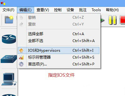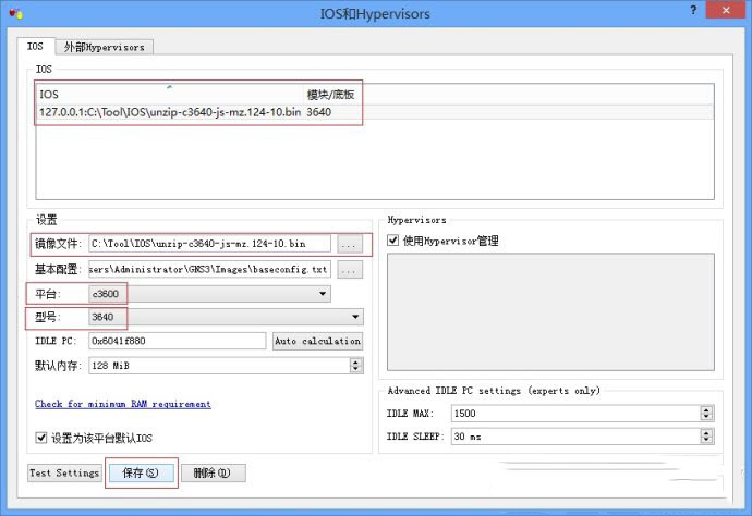 接下来,指定IOS文件。点击编辑-IOS和Hy,选择镜像文件,注意IOS目录中不能包含中文。选择平台和型号。IOS文件名中已经标识该型号为3640。然后点击保存关闭即可。