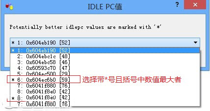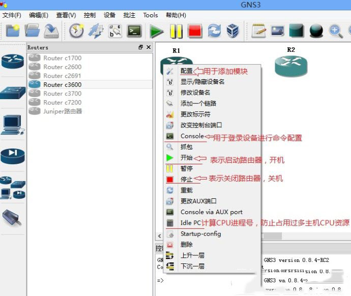 接下来是计算路由器的idle值,该值用于区分路由器CPU和主机CPU的进程控制,防止模拟器占用过多CPU资源。选择带有*的idle值,多个*时选择括号中数值较大的。没有出现*的,多计算几次。建议在计算idle时关闭其他运行程序。做法是,拖出一台路由器3640,右击开机,状态图标会从红色变为绿色。然后右击console,登录到路由器中。然后右击路由器的idle选项进行计算。计算完成后再次关闭路由器。