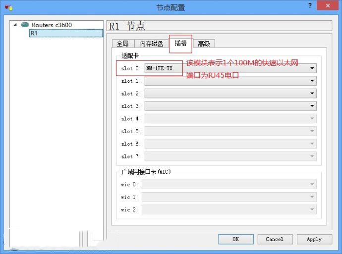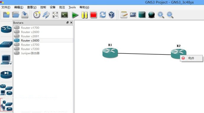 接下来是拓扑的搭建。拖动两台路由器出来。路由器右击配置,选择插槽,在slot 0中选择NM-1FE-TX,点击OK。这个模块表示1个100M的快速以太网端口,接口类型是RJ45电口。然后是连线。点击连线按钮。然后将两台路由器的f0/0连接起来。然后再次点击连线按钮完成拓扑连接,然后开机。