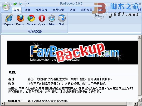 FavBackup是一个浏览器备份还原工具,该软件可以备份浏览器的收藏夹等,兼容Windows7/Windows8/Windows10/Vista/XP/2000操作系统,简单易用的网页浏览器设置与其他数据备份和恢复的Windows应用程序,你甚至不必安装即可使用。FavBackup支持IExplrer、Firefox、Opera、Safari 与 Google Chrome等各版本的网页浏览器,可以备份包含书签、Cookies、下载纪录、浏览纪录、浏览器设置、储存在浏览器中的密码、搜寻引擎、会话、工具栏设置及其他使用者个性化设置。透过非常简单的操作介面执行备份、还原等操作,让我们可以快速将原来电脑系统中的浏览器设置快速的搬迁到新的电脑或新的系统中,马上恢复工作,需要的用户欢迎前来下载使用。