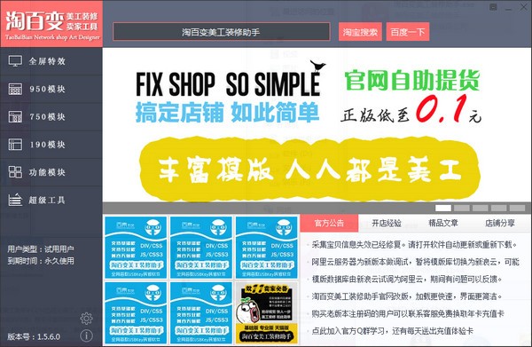 淘百变美工助手是一款全新的淘宝旺铺装修辅助软件,淘百变美工助手包含超过40款特效展示以及店铺装修的各种小工具,人性化的操作让你的淘宝店铺焕然一新