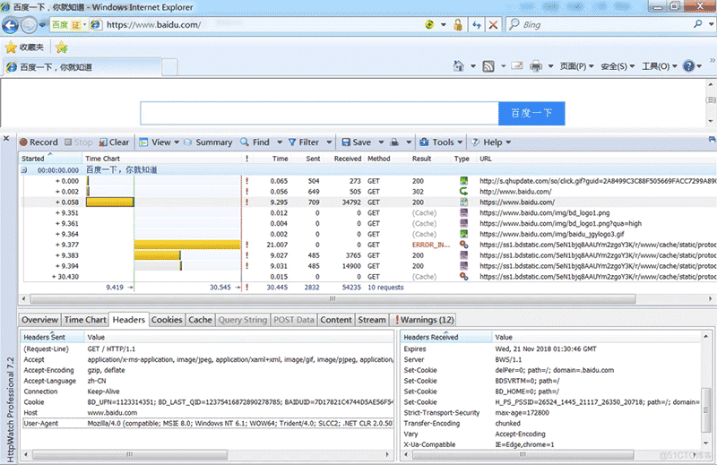 然后单击显示在IE下方的HttpWatch中的记录,让HttpWatch记录IE发送的http请求
