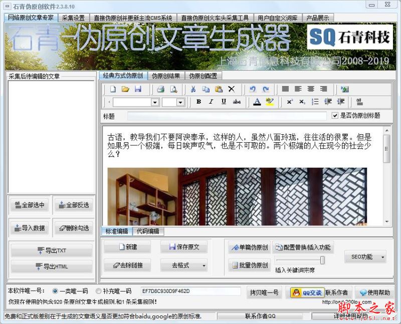 石青伪原创工具伪原创工具是一款SEO高级工具,专门用来生成原创及伪原创文章,使用伪原创工具可以制作出互联网上具有唯一性的伪原创文章,支持中文和英文伪原创。