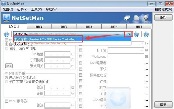 1、首先我们在软件主界面中选择想要配置的网卡。点击下拉按钮,选择本地连接;