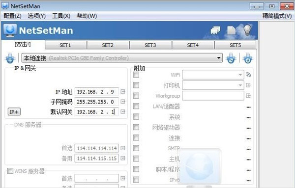 NetSetMan中文版是一款专业的网络切换工具,用于本地网络快速切换的网络设置管理器,NetSetMan网络配置工具可以设置计算机IP地址,子网络遮罩,默认网关,DNS,计算机名称,工作组,WINS等配置;保存多条网络配置启用自定义网络配置;多组不同网络参数值,针对不同网络环境调用不同参数,省去时间及繁杂的设置步骤.
