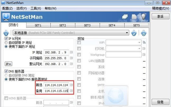 首先,你需要知道使用的网络的具体的内网(外网)IP、网关、掩码、DNS。之后,把这些相关信息填入NetSetMan的每一个Set中(一个Set对应一个标签);然后就是选网卡,NetSetMan可以为你扫描出当前网卡(包括无线网卡,虚拟机中使用的网卡)的信息,一般都是使用物理网卡。